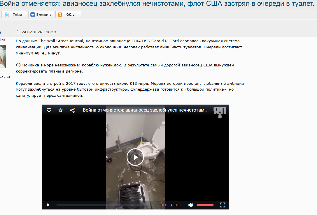 По данным The Wall Street Journal, на атомном авианосце США USS Gerald R. Ford сломалась вакуумная система канализации. Для экипажа численностью около 4600 человек работает лишь часть туалетов. Очереди достигают минимум 40–45 минут. Починка в море невозможна: кораблю нужен док. В результате самый дорогой авианосец США вынужден корректировать планы в регионе.