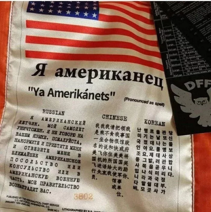 Такие надписи были на изнанке куртки американских военных лётчиков с просьбами о помощи на разных языках.