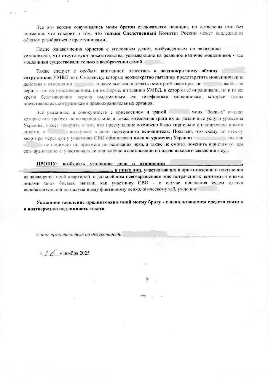 Сейчас гражданский иск заморожен, поскольку Дмитрий находится на фронте. Однако сам боец не стал ждать у моря погоды и подал встречное заявление в Следственный комитет по статье «Мошенничество», защищая своё право на собственность.