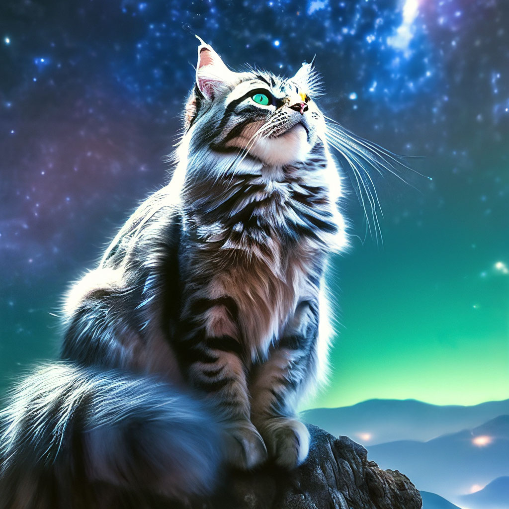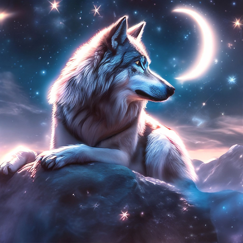 Котик на этой картинке больше напоминает волка на фоне неба с луной.